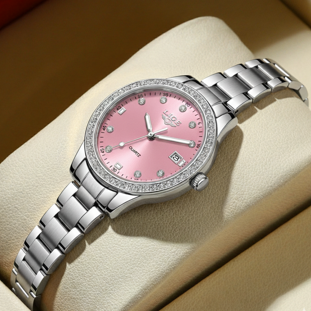 Ceas de dama Premium Quartz Pink LIGE, mecanism quartz precis, carcasa din otel inoxidabil de 34 mm, geam Hardlex si bratara eleganta.